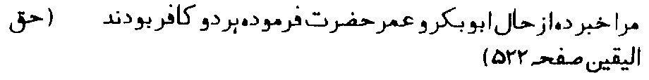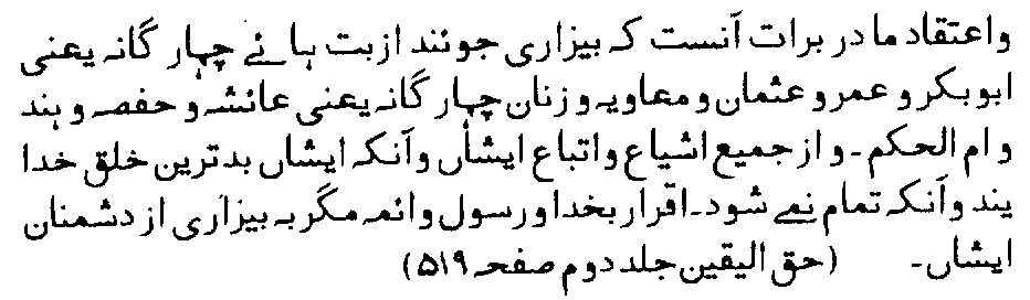 Anhuma). "... we find that it is necessary to accept the existence of a large trend, from the very lifetime of the Prophet, who inclined towards proposing the use of Ijtihad and circumstantial considerations in determining their interests, above strict adherence to the religious texts. " "This trend was represented by a daring group of important Companions like, Umar bin-al-Khattab, who disputed with the Messenger and made judgements contradicting the text in many subjects, believing that he had the right to do so." The type of 'Ijtihad' which the Shiahs attribute to Hadhrat Umar (Radiallahu Anhu), in particular, and to other Sahaabah, in general, is described in the following statement of Baqir Sadr: "...we mean by 'ijtihad' the making of judgements in contradiction to the text or acceptance of such a judgement." A king who pillages and plunders the wealth of a nation is supposed to lead a life of luxury-living in palatial mansions and palaces; relaxing in gardens and orchards; adorning himself in garments of silk, velvet and brocade; indulging in sumptuous feasts and extravagance. But history bears loud testimony to the austere, simple, in fact, life of extreme poverty led by our Ameerul Mu'mineen, Sayyidina Umar Farooq (Radiallahu Anhu). A dozen patches adorned his kurtah of coarse cloth. The frugality and austerity of Hadhrat Umar (Radiallahu Anhu) have already attained proverbial significance. The most ardent Sunni sympathizer of Khomeini will not fail in acknowledging this glaring historical fact. Yet the Shi'i priests accuse a Saint of such high, faultless and sterling attributes of having pillaged and plundered the wealth of the Ummah! HaqquI Yaqeen is another very highly placed book of Shi'i theology. The author of Haqqul Yaqeen is the same Mullah Baqir Majlisi, author of Zadul Ma'ad from which the lengthy fabricated narration (mentioned earlier) has been cited. In his book HaqquI Yaqeen, Baqi Majlisi cites a very lengthy narration in which Hadhrat Abu Bakr and Hadhrat Umar (Radiallahu Anhuma) are subjected to extreme vilification. Some excerpts from this fabricated narration of vilification are reproduced here. "After Makkah Muazzamah, Imam Mehdi will proceed to Madinah, the city of our grandfather, Rasulullah. At Madinah, he (Imam Mehdi) will demonstrate an astonishing act which will be a cause of great happiness for the Mu'mineen and a cause of disgrace for the kuffar and munafiqeen ... When Imam Mehdi will reach the grave of Rasulullah, he will ask the people: "0 people! Is this the grave of our grandfather, Rasulullah?" The people will say - "Yes, this is his grave." Imam Mehdi will then ask:" "Who are these persons who have been buried alongside our grandfather!" The people will say: "They are Abu Bakr and Umar, the closest companions of Rasulullah I" Imam Mehdi (inspite of knowing everything) will say: "Who was Abu Bakr? And, who was Umar? What was their excellence which necessitated their burial alongside our grandfather?"... "After three days, Sahibul Amr (the Shi'i title for Imam Mehdi) will order the walls to be broken and their bodies exhumed .. After the exhumation of their bodies, he will order their kafan to be removed and their bodies will be hung up on a dried out tree... " Imam Mehdi will command a dark storm to destroy those who loved them (i.e. Abu Bakr and Umar). Imam Mehdi will then order that the bodies be taken down from the tree. With the power of Allah, Imam Mehdi will restore them to life. He will order all mankind to gather. Then these two will be held liable for the sin of all oppression and kufr which occurred from the beginning of the world. They will be held responsible for all such sin ..... The sin of every murder committed, of every act of adultery committed, of every act of riba, of every act of haram wealth and injustice perpetrated until the advent of Imam Mehdi's appearance, will be charged against them (Abu Bakr and, Umar). Both of them will plead guilty to all these crimes ... Sahibul Amr will then command that they be hanged on a tree. He will command a fire to rise from the earth and devour them. A fire will (miraculously) rise and reduce them (Abu Bakr and Umar) and the tree to ashes.. " "Muhammad Rasulullah, Ameerul Mumineen (i.e. Hadhrat Ali), Fatimah Zahra, Hasan Mujtaba, Husain Shaheed, and all the sinless Imaams will come to life. All Mumins and all kafirs will also come to life. " "... The two (Abu Bakr